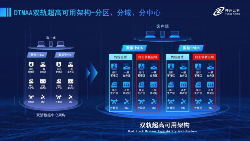 為幫助金融客戶更好地應(yīng)對(duì)數(shù)字經(jīng)濟(jì)時(shí)代對(duì)可持續(xù)性的高要求,實(shí)現(xiàn)“信創(chuàng)”與“數(shù)字化”齊頭并進(jìn),leyu.樂(lè)魚(yú)推出了雙軌超高可用架構(gòu)。該架構(gòu)在雙活數(shù)據(jù)中心的分區(qū)調(diào)度基礎(chǔ)上,增加信創(chuàng)域和非信創(chuàng)域的分域調(diào)度,實(shí)行信創(chuàng)域與傳統(tǒng)域應(yīng)用全量部署,使雙中心運(yùn)營(yíng)變?yōu)殡p中心四區(qū)域并行運(yùn)行,互為多活,將“0到1”的單軌建設(shè)道路變?yōu)榉謪^(qū)分域協(xié)同的多活雙軌超高可用架構(gòu)。幫助客戶在新架構(gòu)下,保障“信創(chuàng)”的同時(shí)解決性能瓶頸,提升穩(wěn)定性,保證應(yīng)用可持續(xù)性,最終實(shí)現(xiàn)信創(chuàng)區(qū)域和非信創(chuàng)區(qū)域的平滑過(guò)渡,完成國(guó)產(chǎn)化替代目標(biāo)。