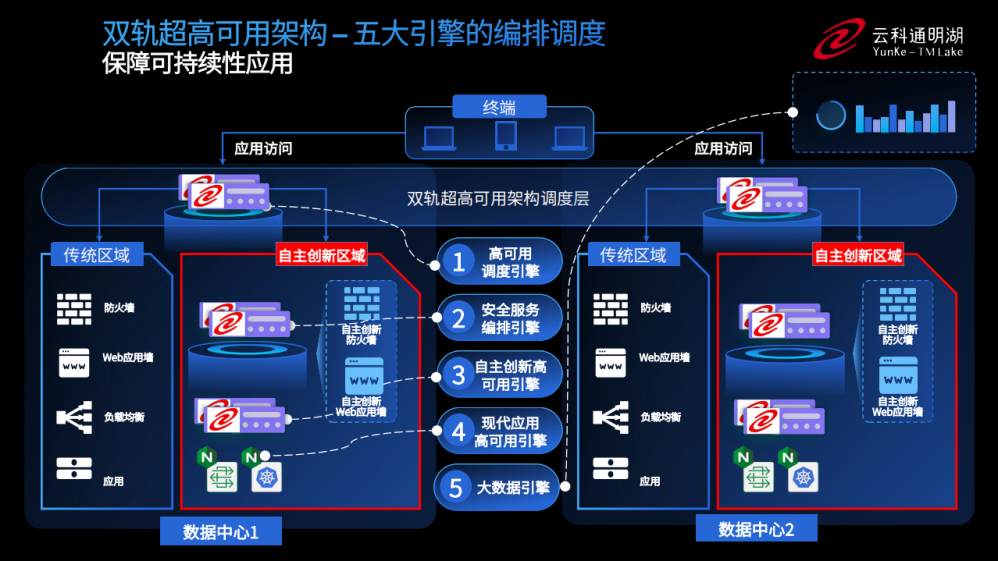 雙軌超高可用架構(gòu)在雙活數(shù)據(jù)中心的分區(qū)調(diào)度基礎(chǔ)上,增加信創(chuàng)域和非信創(chuàng)域的分域調(diào)度,實(shí)行信創(chuàng)域與傳統(tǒng)域應(yīng)用全量部署,使雙中心運(yùn)營(yíng)變?yōu)殡p中心四區(qū)域并行運(yùn)行,互為多活,將傳統(tǒng)架構(gòu)變?yōu)榉謪^(qū)分域協(xié)同的多活雙軌超高可用架構(gòu)。幫助客戶(hù)在新架構(gòu)下,保障“信創(chuàng)”的同時(shí)解決性能瓶頸,提升穩(wěn)定性,保證應(yīng)用可持續(xù)性,最終實(shí)現(xiàn)信創(chuàng)區(qū)域和非信創(chuàng)區(qū)域的平滑過(guò)渡,完成國(guó)產(chǎn)化替代目標(biāo)。