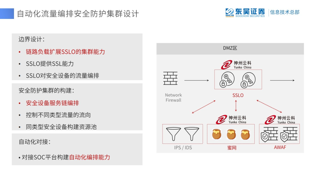經(jīng)過以上架構(gòu)替換,東吳證券解決了串聯(lián)架構(gòu)的擴展性問題、加密流量可見性問題以及安全策略無法適應業(yè)務敏捷迭代問題,提升了運維的靈活性,實現(xiàn)了基于服務鏈的流量調(diào)度,保障了網(wǎng)絡和安全投資回報最大化。